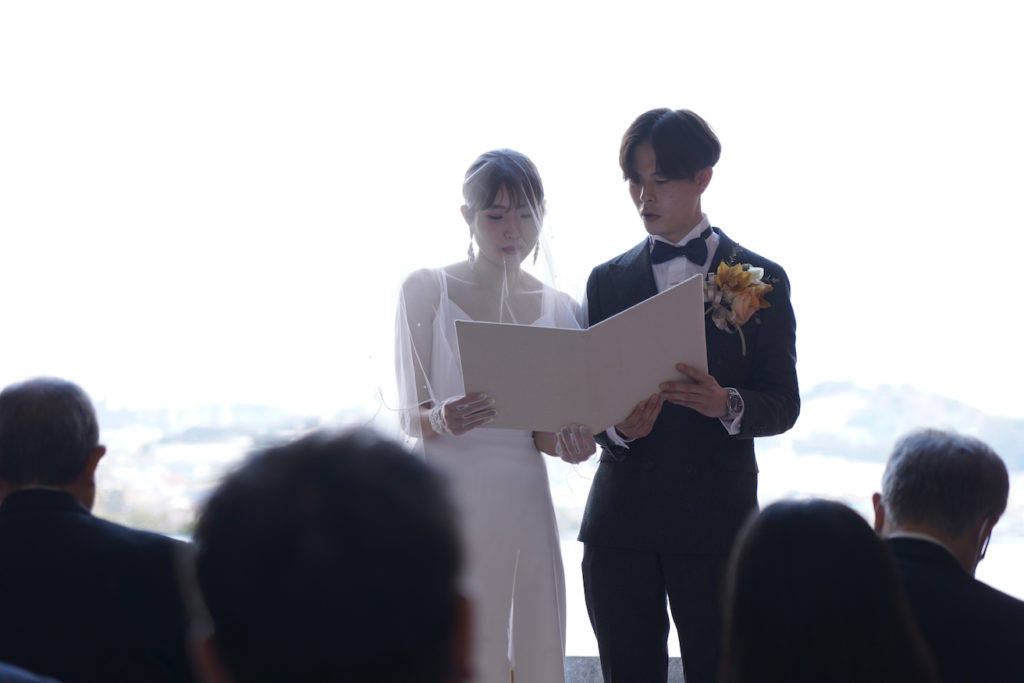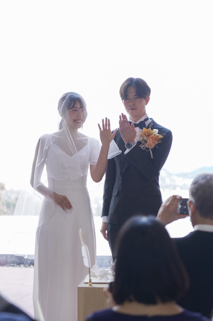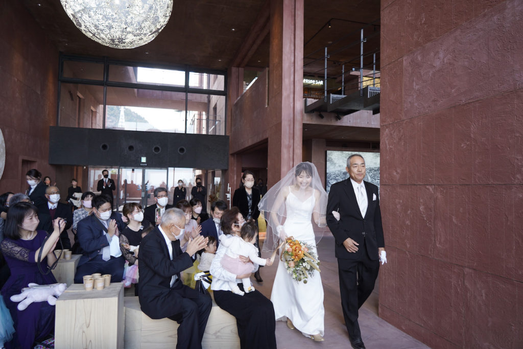 挙式会場は1Fエントランスにて。おふたりのお子さまも参加され別府の絶景を背に人前式を行いました。