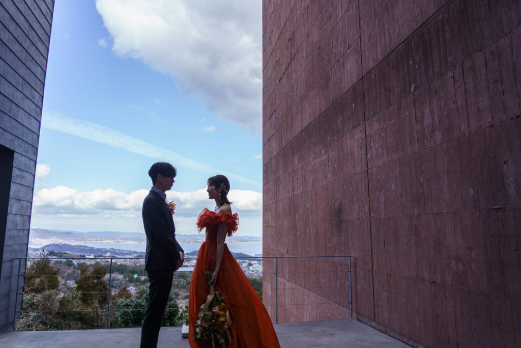お子様も多く出席され、お食事を楽しまれながらも終始にぎやかな披露宴でした。また、披露宴後には別府湾を臨むテラスにておふたりだけの写真もお撮りする事が出来ました。”ガレリア御堂原”さんは朝見川断層という有名な断層上にあり、絶景のロケーションです。素敵なおふたりも相まって、本当に絵になりますね。末長くお幸せに。
