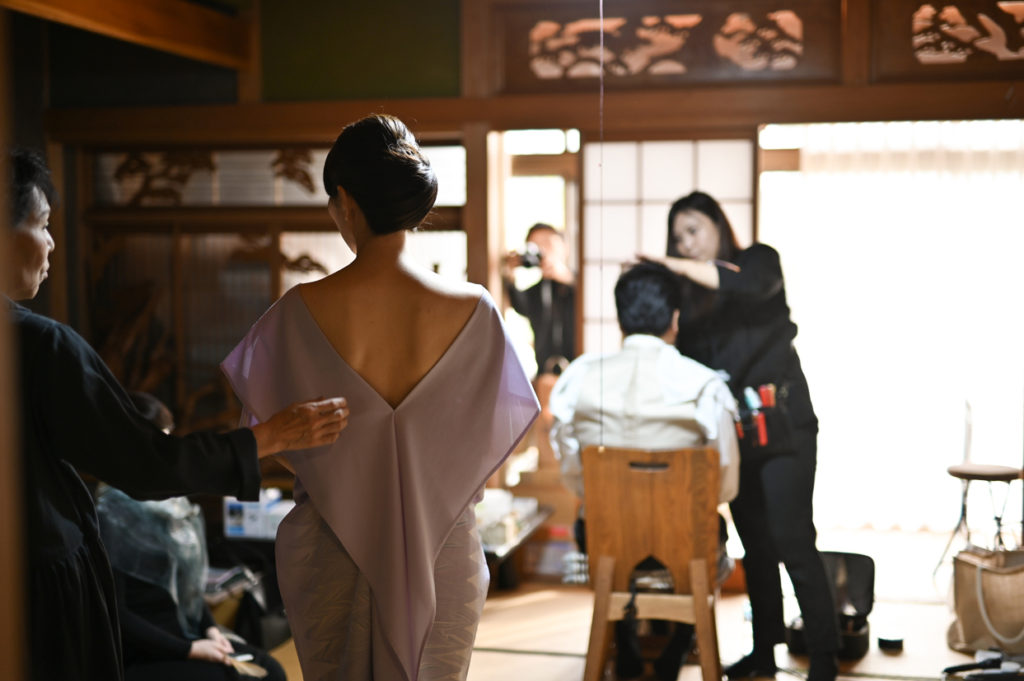この日は伝統にならってご実家で着付け。その後撮影にでかけました。